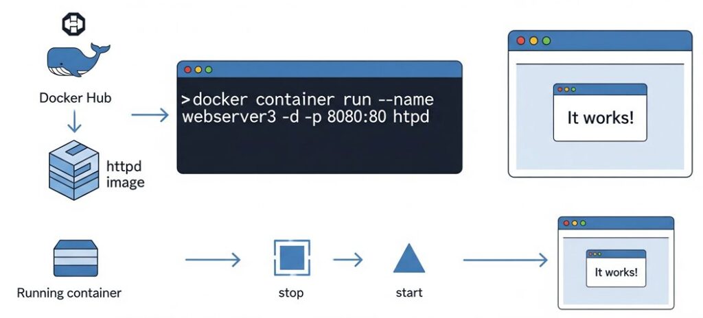 ここでは httpdイメージを使ったApacheコンテナの実行方法 を紹介していきます。Apacheはウェブサーバーとして非常に有名で、Dockerを学ぶときの良い題材にもなります。実際にコマンドを動かして、Apacheコンテナのライフサイクルを体験してみましょう。