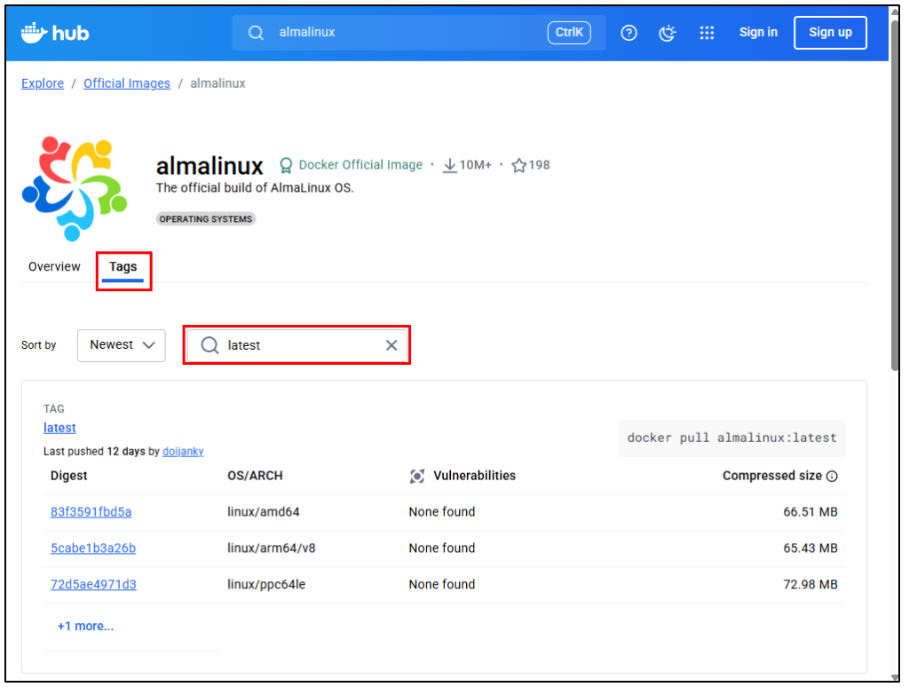 docker image pull almalinuxタグを省略すると latest が適用され、最新のAlmaLinuxが取得されます。