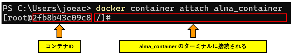 PS C:\Users\joeac> docker container attach alma_container