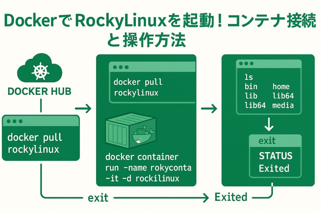 ここでは、DockerでRockyLinuxを起動し、実際にコンテナへ接続して操作する方法 を紹介します。RockyLinuxはエンタープライズ用途で注目を集めているLinuxディストリビューションで、Dockerを学ぶ上でも非常に役立ちます。