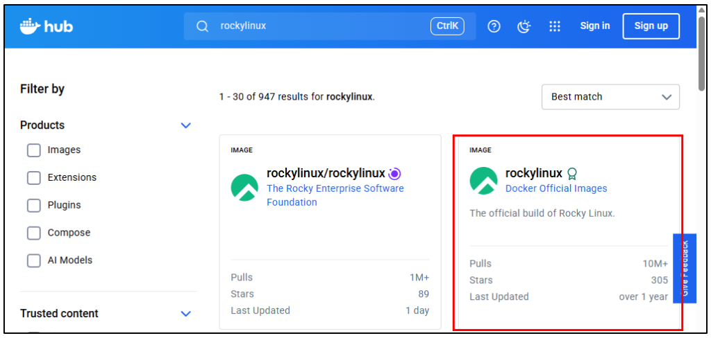 Docker Hubで「rockylinux」を検索します。