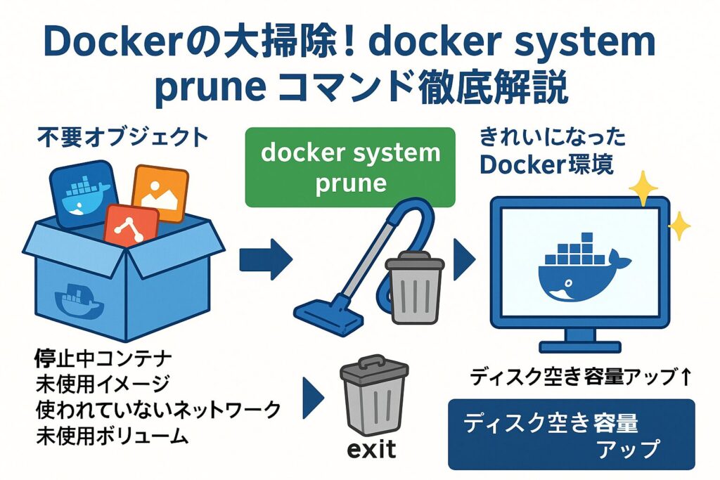 Dockerを使っていると、いつの間にか使わないコンテナやイメージが溜まって、ディスク容量を圧迫してしまうことがあります。そんな時に役立つのが docker system prune コマンドです。まさに「Dockerの大掃除」といえるコマンドで、一気に不要なオブジェクトを整理できます。ただし、強力なコマンドなので実行時には注意も必要です。ここでは、仕組みや使い方、オプションをわかりやすく解説していきます。