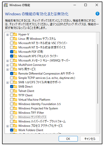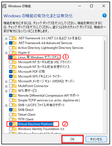 | Virtual Machine Platform(仮想マシン プラットフォーム) | Linuxカーネルを動かすために必要な仮想化機能 |