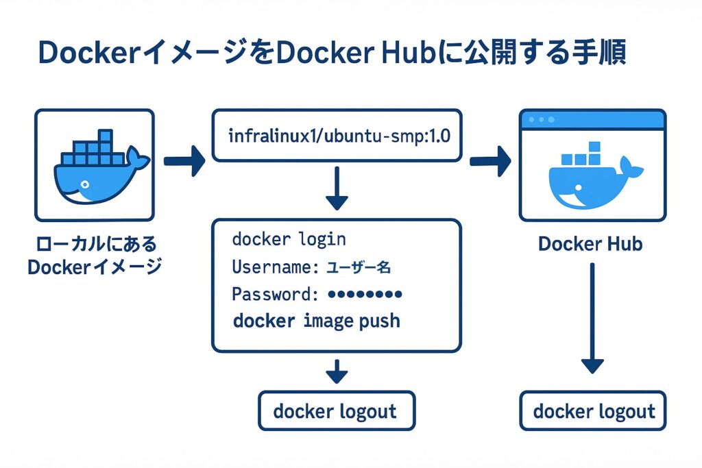 せっかく作ったDockerイメージ、ローカルに置いておくだけではもったいないですよね。Docker Hubに公開すれば、他のPCやチームメンバーからも簡単に利用できるようになります。ここでは、Dockerイメージを タグ付け → ログイン → アップロード → ログアウト の流れで解説します。