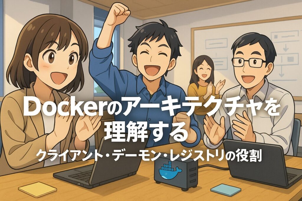 Dockerのアーキテクチャを理解するには、登場する要素ごとに役割をしっかり整理して考えるのがわかりやすいです。Dockerはクライアント・サーバーモデルをベースに設計されており、それぞれの役割が明確に分担されています。ここでは、クライアント、デーモン、そしてレジストリについて、図や表を使って親しみやすく解説します。