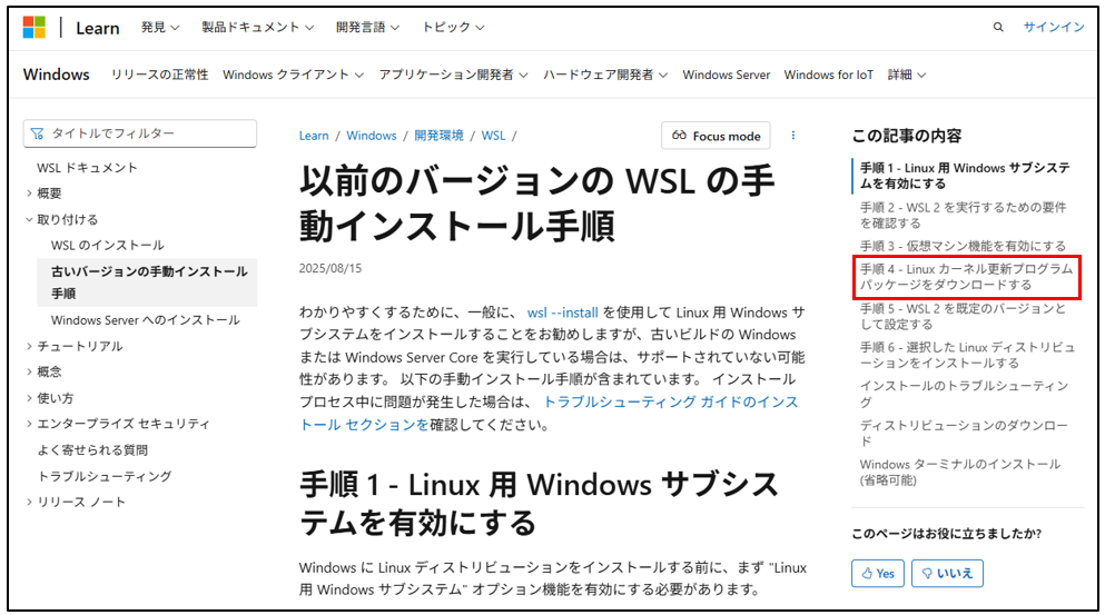 | 1 | 「以前のバージョンの WSL の手動インストール手順」のページにアクセス |