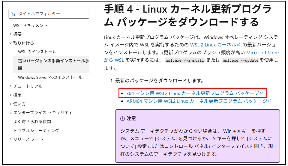 - 手順ページ:https://learn.microsoft.com/ja-jp/windows/wsl/install-manual#step-4---download-the-linux-kernel-update-package