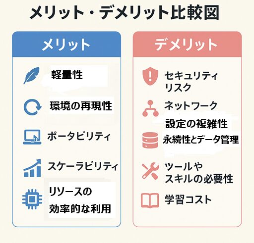 コンテナはとても便利で効率的な技術ですが、「導入すればすべてが解決!」という魔法の道具ではありません。メリットとデメリットを整理したうえで、自分たちのプロジェクトに本当にフィットするかを考えるのが大切です。