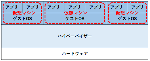 | ハイパーバイザー型仮想化 | ハードウェアの上に直接ハイパーバイザーを入れてVMを管理 | リソース効率が高い。サーバー環境でよく使われる。 |