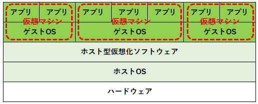 | ホスト型仮想化 | 既存のOS(ホストOS)の上に仮想化ソフトウェアを入れてVMを動かす。 | 導入が簡単。既存PCで試せるが、性能はホストに依存する。 |