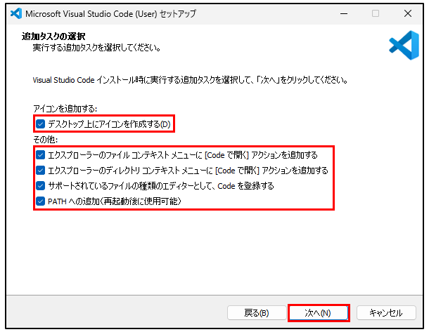 必要に応じてチェックを入れて「次へ(N)」