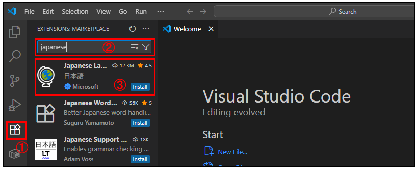 3.➂「Japanese Language Pack for Visual Studio Code」 をクリック