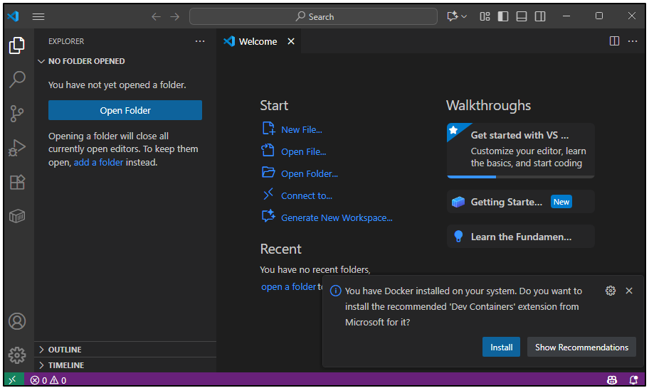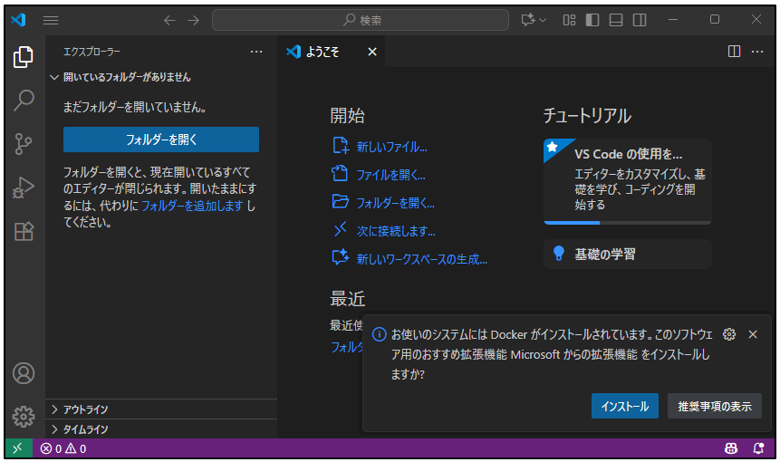 ここまでの流れで、VS Codeをインストールし、日本語化し、Docker開発を支える拡張機能を導入できました。