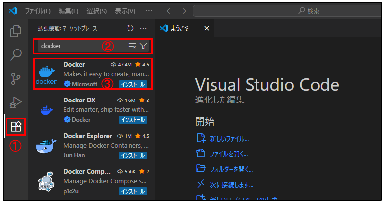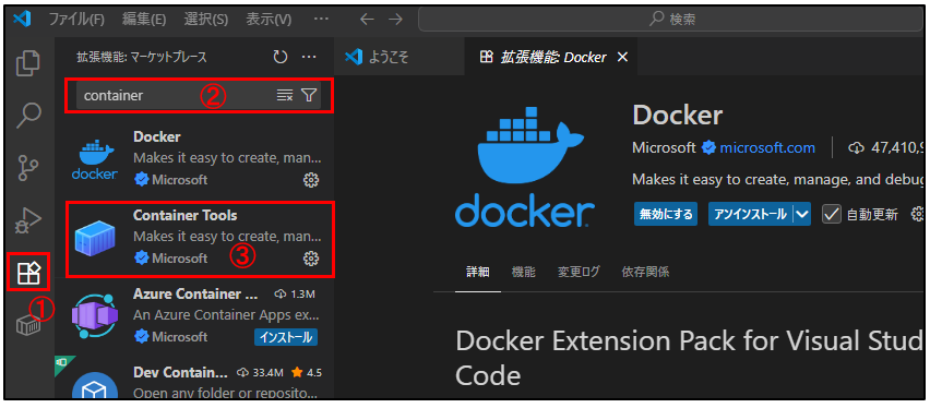 3.②「Docker拡張機能」 をクリック