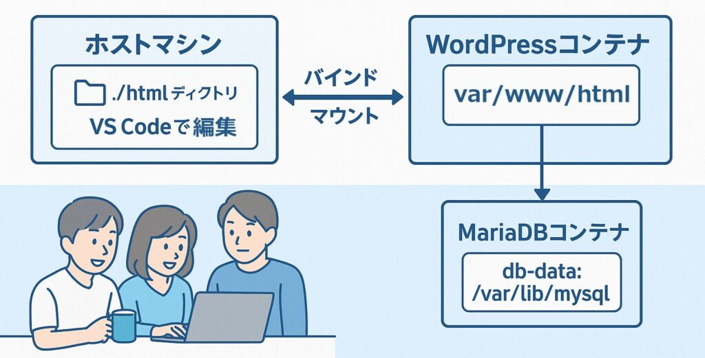 MariaDB はボリュームで永続化し、WordPress はホストフォルダを直接マウントしてリアルタイム編集を可能にします。