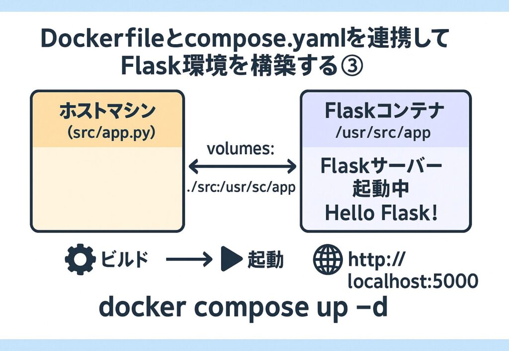 前回(②)では、Flaskアプリとcompose.yamlを作成し、Dockerfileとの連携準備が整いました。
