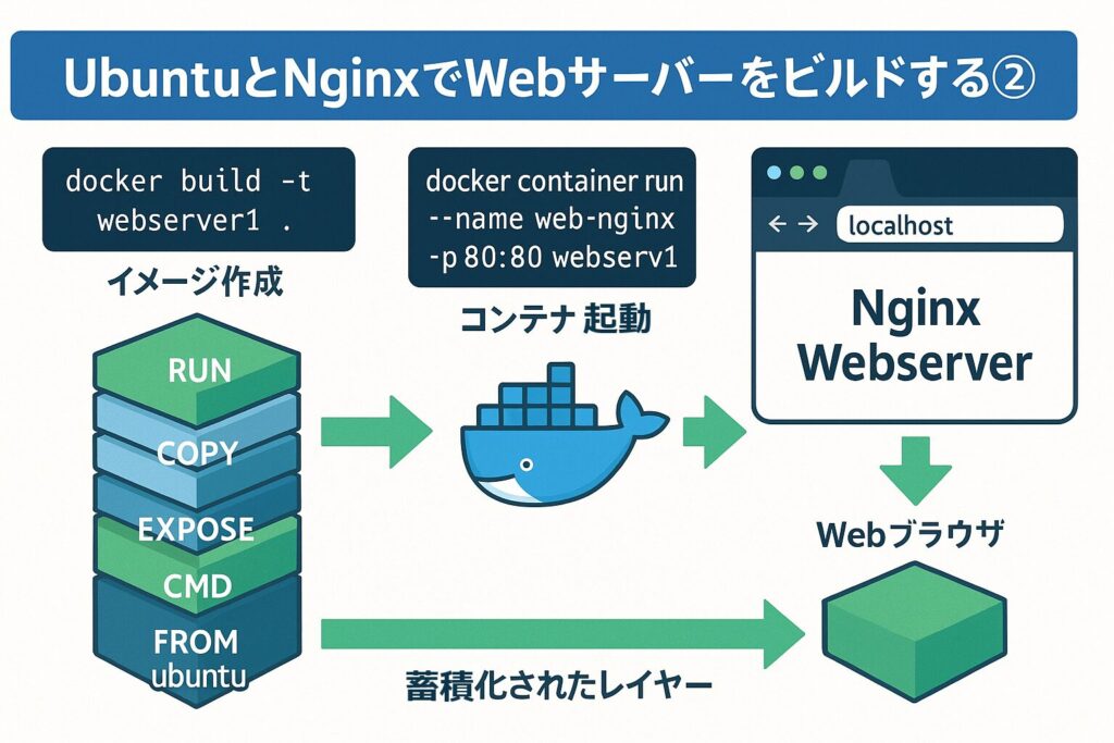 今回は「UbuntuとNginxでWebサーバーをビルドする②」として、実際にイメージをビルドし、コンテナを起動してブラウザで動作確認しました。さらにDockerfileの命令ごとにレイヤーが構築される仕組みも解説しました。