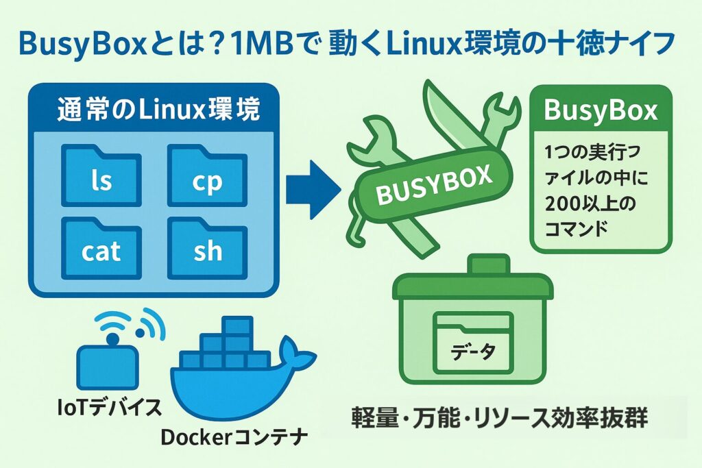 LinuxやDockerを使っていると時々出てくる「BusyBox」という名前。実はこれ、システム運用や組み込み環境で大活躍する、とても軽量で頼れるツールなんです。あの小さな1MBの実行ファイルに、200種類以上のUNIXコマンドがぎゅっと詰め込まれていると聞くと、ちょっと驚きませんか?そんなBusyBoxは、まさに「Linux界の十徳ナイフ」と呼ぶにふさわしい存在です。