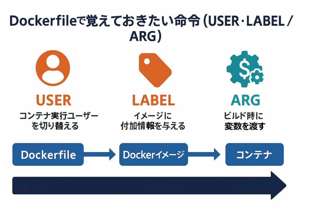 ここでは USER・LABEL・ARG の3つに注目して解説します。これらを理解しておくと、セキュリティを強化したり、イメージに情報を付加したり、ビルドを柔軟にしたりできる ようになります。