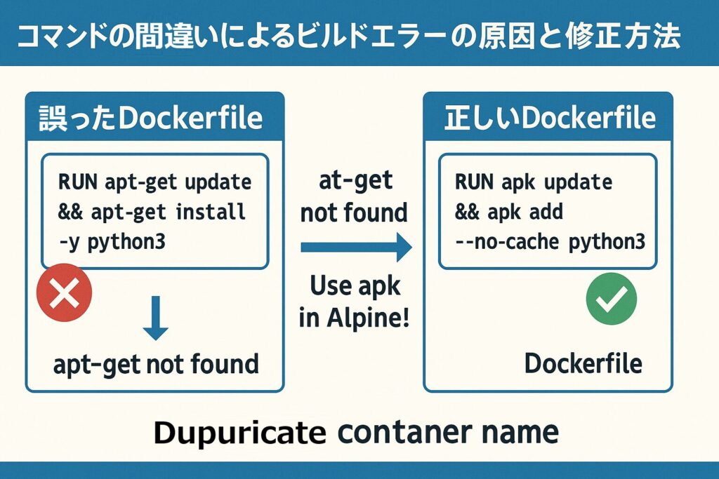 つまり、Alpine Linuxにはapt-getがインストールされていないため、ビルドに失敗しているんですね。