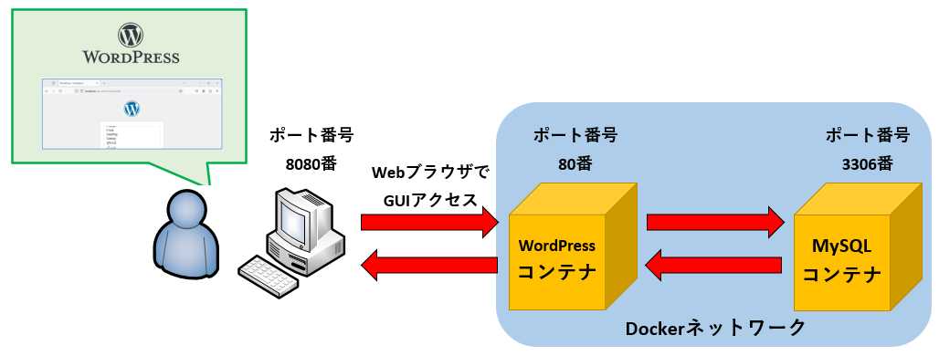 以下に、実際にWordPressコンテナとMySQLコンテナを作成・実行する手順を詳しく解説します。