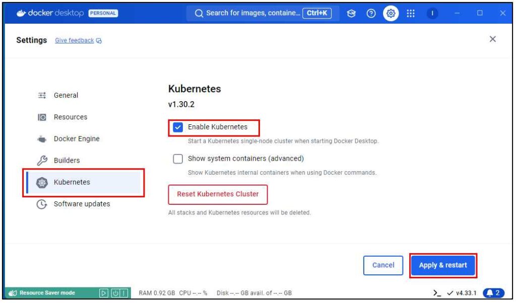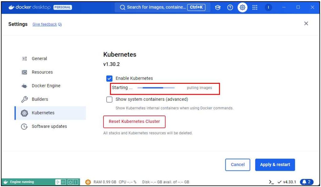 ・「Enable Kubernetes」にチェックを入れた後、「Apply & restart」ボタンをクリックします。これにより、Kubernetesのクラスタがインストールされ、起動されます。