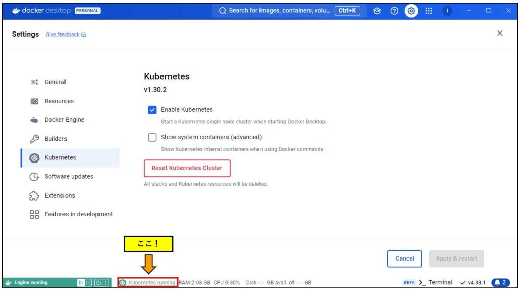 「Enable Kubernetes」のチェックを外すことで、Kubernetesを停止できます。これにより、リソースの消費を抑えられます。 - Kubernetesの初期化