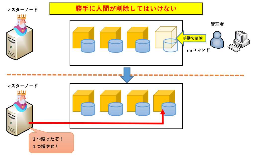 | 手動での削除 | Dockerコマンドでコンテナを手動で削除することも可能ですが、その場合Kubernetesは「望ましい状態」から外れたと認識し、削除されたコンテナを自動で再作成します。 |