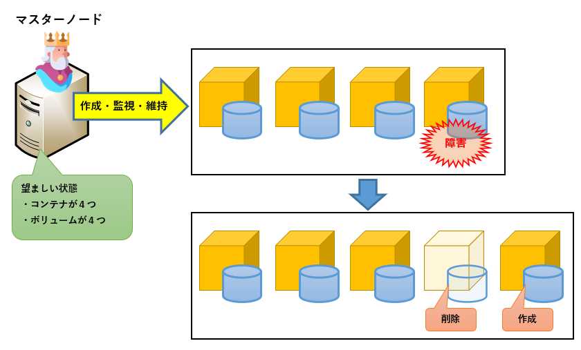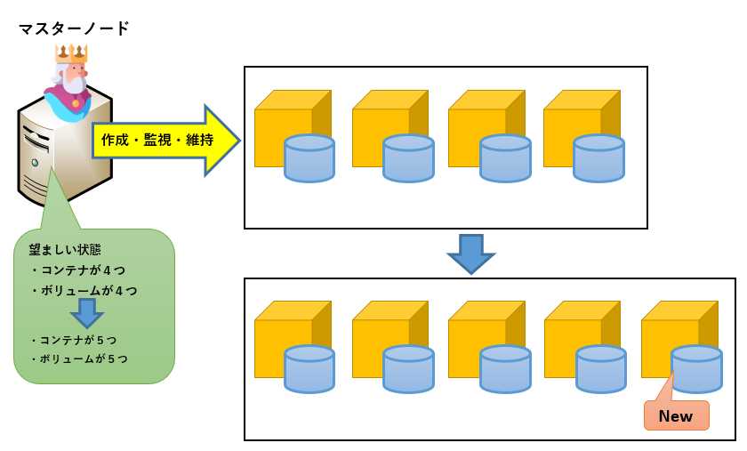 運用中Kubernetesはこの定義に基づいて、指定された数のコンテナやボリュームを作成し、監視を行います。