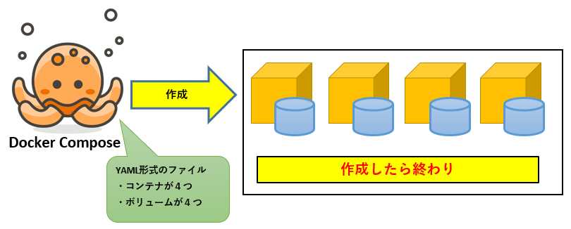 初期状態YAMLファイルで「コンテナ×個、ボリューム〇個」という構成を定義します。