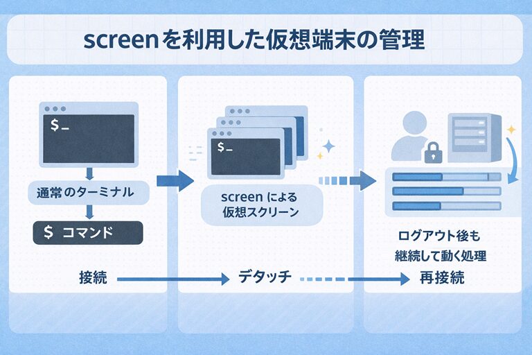 このページでは、screen の基本的な考え方から、実際の操作手順までを、表や具体例を交えながらやさしく解説していきます。