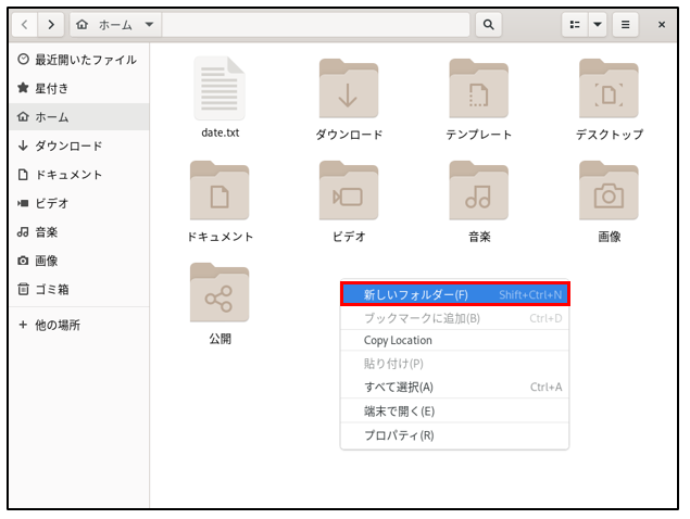 ・ホームディレクトリ上で「新しいフォルダー」を作成します。