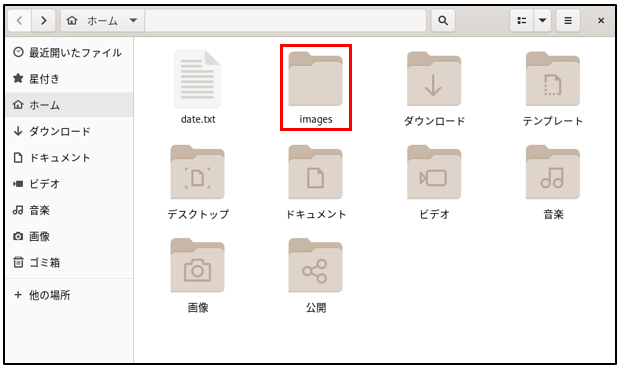 まず、ユーザーのホームディレクトリ /home/user 配下に、新しく images ディレクトリを作成します。