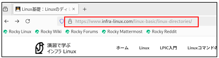 ・URLに「https://www.infra-linux.com/linux-basic/linux-directories/」と入力して、当サイトの「Linux基礎:Linuxのディレクトリ」記事にアクセスします。
