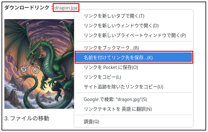 ・右クリックをしてポップアップメニューを表示し、「名前を付けてリンク先を保存」を選択して「dragon.jpg」をダウンロードします。