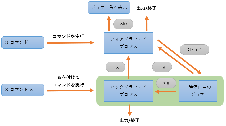 - フォアグラウンドジョブは端末を占有し、バックグラウンドジョブは裏で処理を続ける。