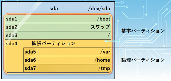 /dev/sda1~/dev/sda4→ 基本パーティション/dev/sda5以降 → 論理パーティション