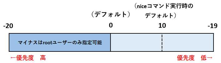 -20から19の間です。 - 優先度を高くする場合は、nice値を低く(例:-20)設定します。