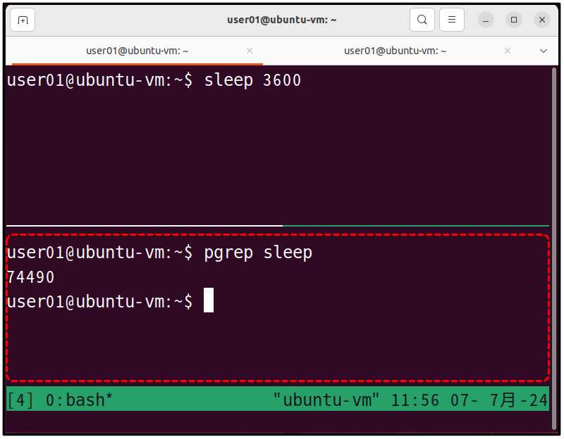 sleepコマンドが実行されている間に、下のペインに移動します。- プレフィックスキー(「Ctrl」+「b」)を押した後、「o」キーを押します。