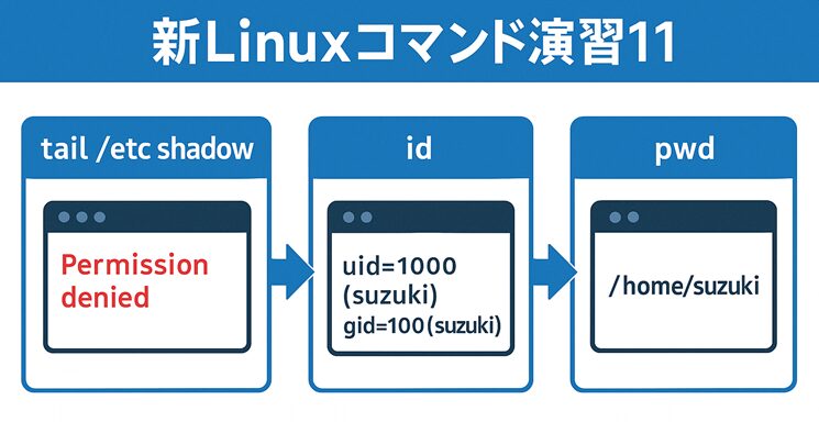 tailコマンドでファイルの末尾を素早く確認し、idコマンドで現在のユーザー情報を取得し、pwdコマンドで作業中のディレクトリ位置を確認する基本操作を習得します。