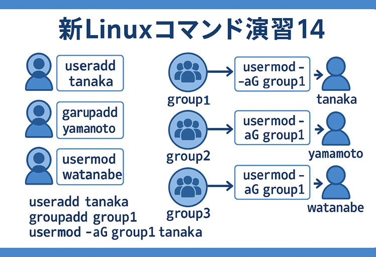 「新Linuxコマンド演習14」では、Linuxシステムの基本的な管理操作であるユーザーとグループの作成・管理を行います。