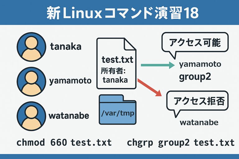 「新Linuxコマンド演習18」では、ファイルの所有者とグループの関係、chmod・chgrp コマンドの使い方を実践的に学びました。