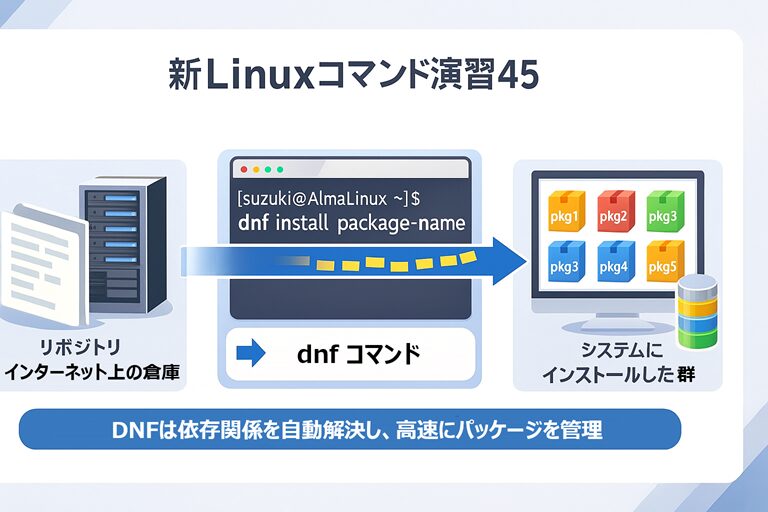 「新Linuxコマンド演習45」では、AlmaLinux 9.6 における標準のパッケージ管理ツール dnfコマンド を学びました。