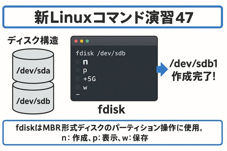 「新Linuxコマンド演習47」では、増設したディスクに対して fdiskコマンド を用いて新しいパーティションを作成する方法を学びます。