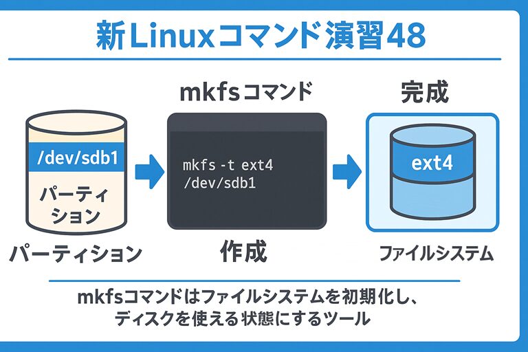 「新Linuxコマンド演習48」では、mkfsコマンド を使用して、増設したディスクに新しいファイルシステム(ext4 / XFS)を作成する方法を学びます。