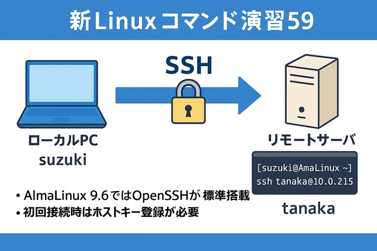 この演習では、SSHの初回接続時の認証手順、再接続時の流れ、接続終了操作など、リモートアクセスの基本操作を実践的に理解します。