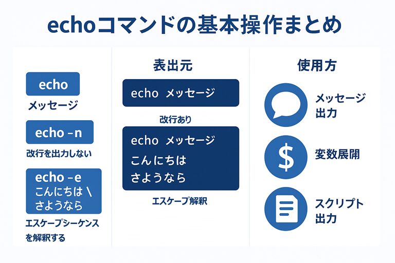 echo コマンドは、Linuxで文字列や変数を画面に表示するための最も基本的なコマンドです。