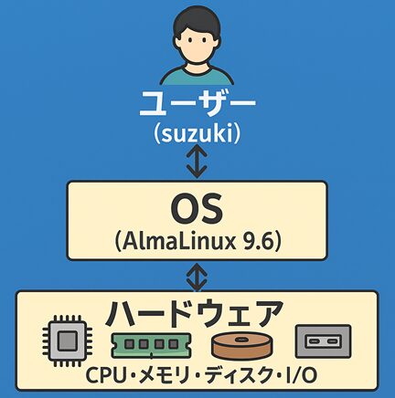 OSがCPU・メモリ・ディスクなどのリソースをまとめて管理し、ユーザーやアプリケーションがスムーズに使えるようにしてくれます。
