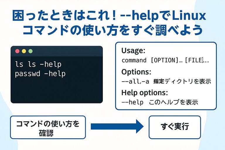 ほとんどのLinuxコマンドには、この --help オプションが用意されており、コマンドの使い方やオプション一覧をその場で表示してくれます。