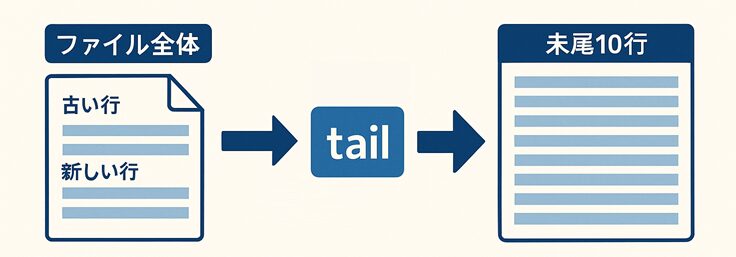 tail(テイル)コマンド は、ファイルの「末尾(最後の部分)」を表示するためのコマンドです。